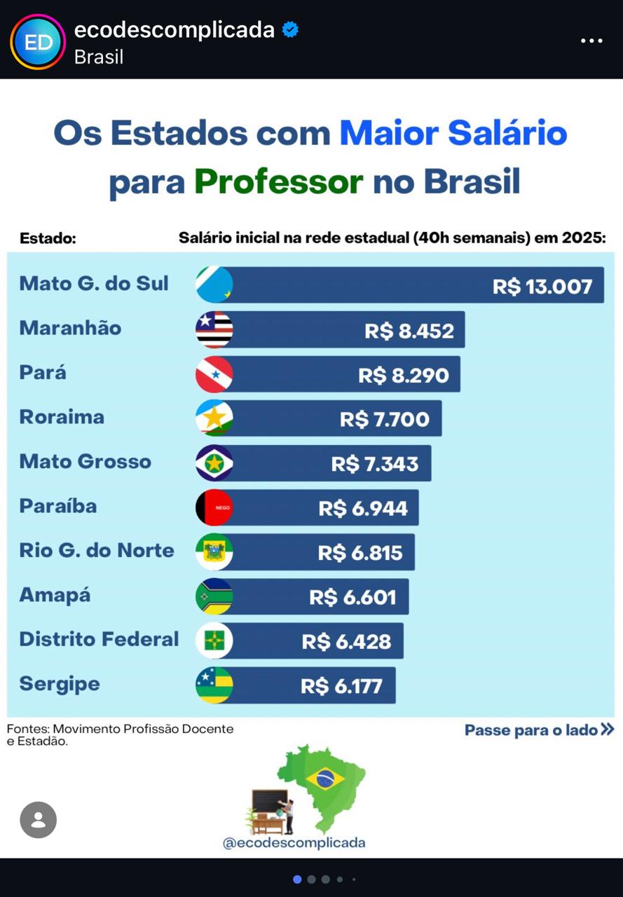 Um estudo divulgado pelo Movimento Profissão e divulgado ontem (31), pelo jornal Estadão, trouxe que levantamento nacional, feito no início do mês de março deste ano, com base em dados oficiais, os salários dos professores nas redes estaduais do Brasil. Segundo o estudo, os professores da rede estadual da Paraíba, se destacam a nível nacional tendo o 2º melhor salário do Nordeste e o 6º do Brasil.