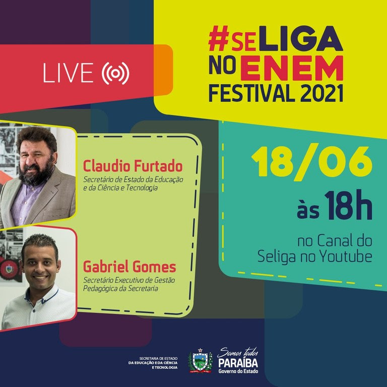 O Se Liga no Enem Festival 2021 terá sua aula inaugural nesta sexta-feira (18), a partir das 18h, no canal no YouTube do Se Liga no Enem Paraíba. Na oportunidade, participam da transmissão o secretário de Estado da Educação e da Ciência e Tecnologia, Cláudio Furtado; o secretário de Gestão Pedagógica, Gabriel Gomes; e a gerente Executiva do Ensino Médio, Léia Gonçalo. A mediação do evento ficará por conta dos professores Caio Américo e Romário Farias. A live inaugural ainda vai contar com a participação dos músicos Ezequiel Sóstenes e Mô Lima.