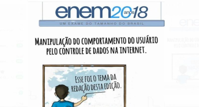 O tema da redação do Exame Nacional do Ensino Médio (Enem) 2018 é “Manipulação do comportamento do usuário pelo controle de dados na internet”, conforme informou o Instituto Nacional de Estudos e Pesquisas Educacionais Anísio Teixeira (Inep).