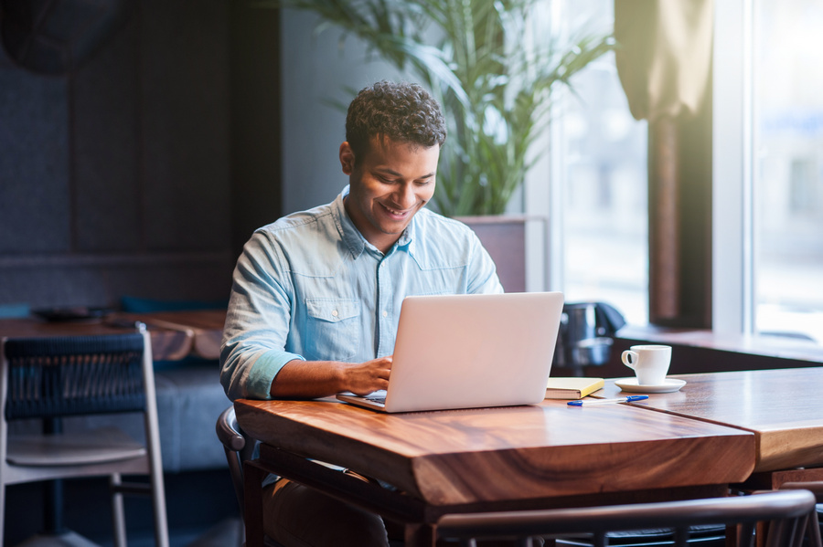 Handsome young Arabian man is typing on a laptop in cafe. He is sitting at desk and smiling