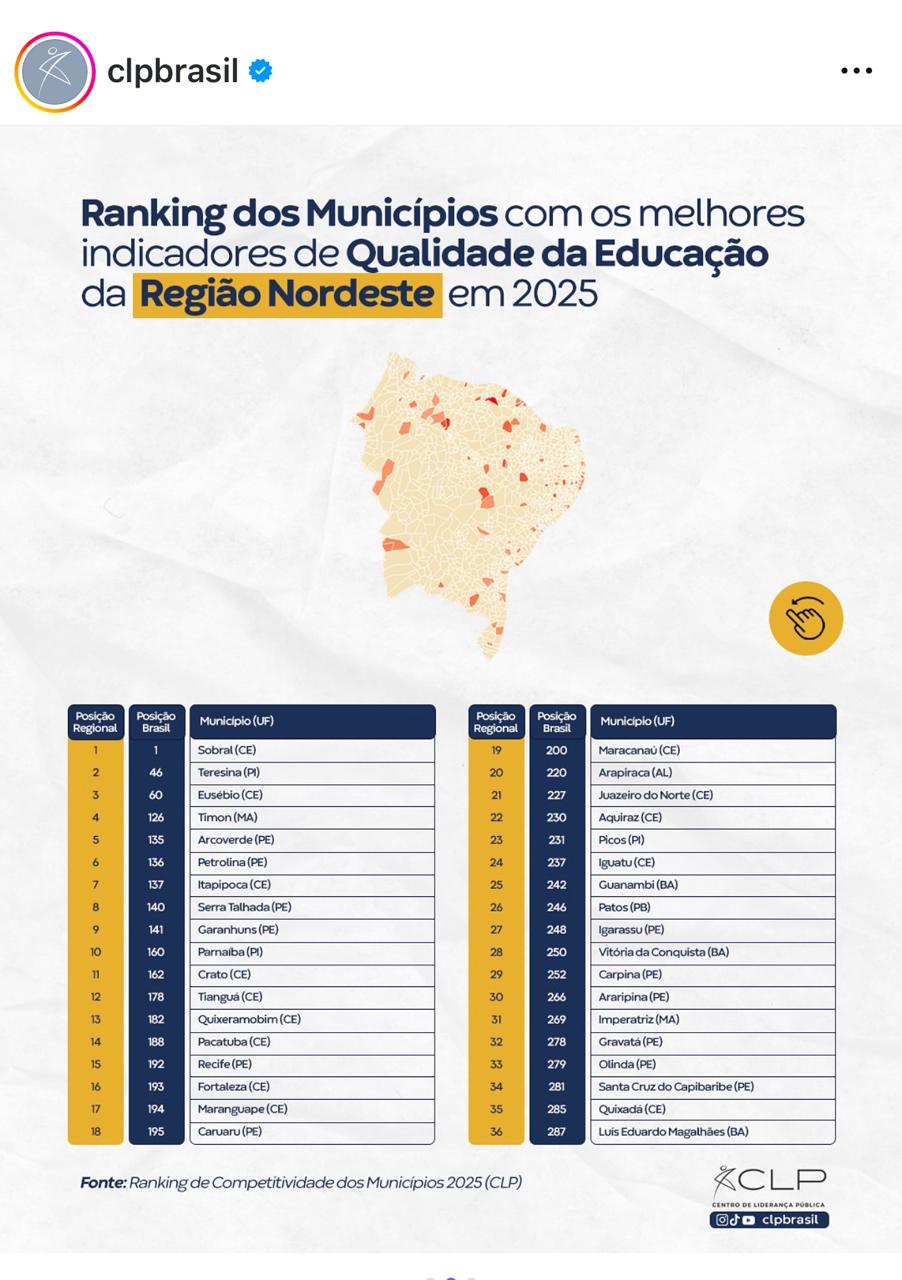 “Municípios que oferecem educação de qualidade formam cidadãos mais autônomos, críticos e preparados para contribuir com o crescimento econômico e social. Sem bons resultados de aprendizagem, o progresso local fica comprometido. Com peso de 6,4% no Ranking, o pilar é essencial para reduzir desigualdades, ampliar oportunidades e garantir o futuro das novas gerações”, comentou um dos organizadores do levantamento.