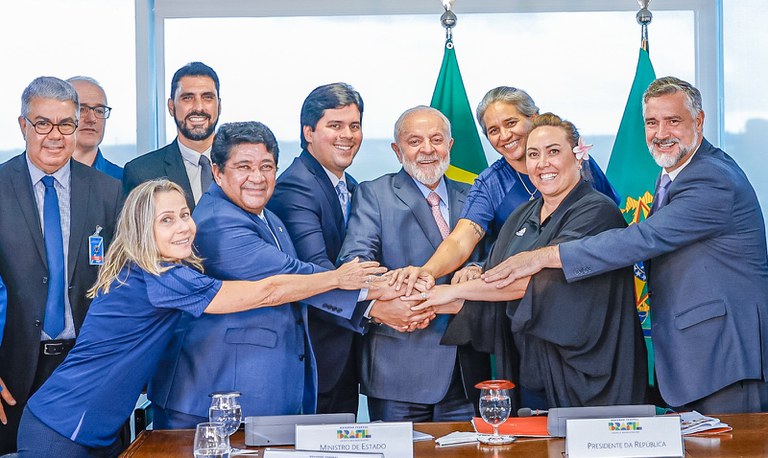 O ministro do Esporte, André Fufuca, o ministro da Secretaria de Comunicação Social, Paulo Pimenta, e o presidente da Confederação Brasileira de Futebol (CBF), Ednaldo Rodrigues, participaram da reunião.