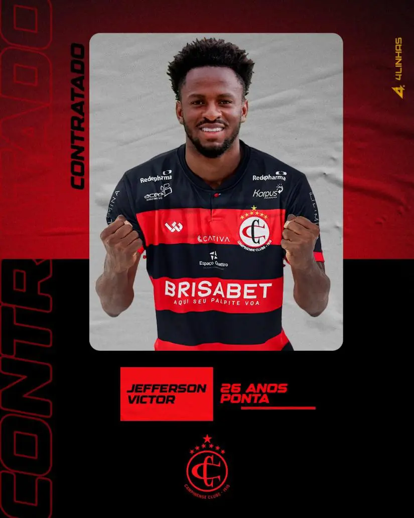 Campinense contrata Jefferson Victor! A Raposa segue reforçando o seu elenco para a sequência da Série D do Campeonato Brasileiro. Nesta segunda-feira (8), o Rubro-Negro encorpou o seu ataque com a contratação do atacante Jefferson Victor, que estava no Figueirense e chega ao clube por empréstimo. O setor ofensivo do Rubro-Negro conta ainda com Pedro Chinês, Thiaguinho, Gilvan, Alex Oliveira, Riquelme, Matheus Lagoa, Júnior Pirambu e Negueba.