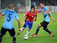 Apesar do bom momento uruguaio no início, no entanto, os donos da casa começaram a acalmar o jogo aos poucos e, através da posse de bola, impor seu ritmo na partida. Com Valdivia responsável pela criação de jogadas, o Chile teve sua primeira oportunidade aos seis minutos, quando Isla recebeu do Mago e cruzou na área, encontrando Vargas, que concluiu mal e mandou por cima da meta.