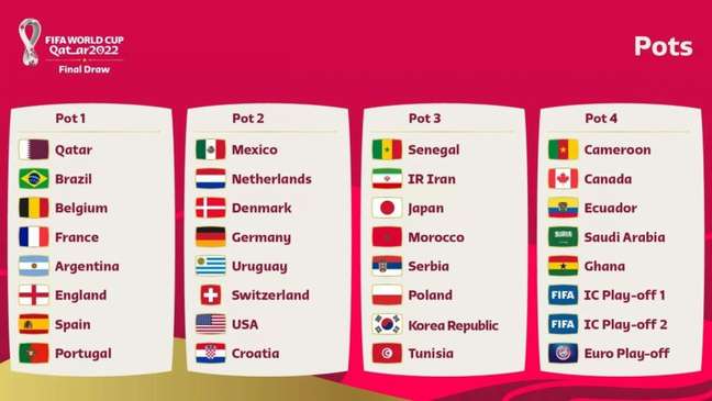 As equipes foram divididas por quatro potes, conforme a posição no ranking da Fifa. As exceções foram o anfitrião Catar (situado automaticamente no pote um, ao lado das sete seleções mais bem colocadas) e as três equipes vindas das repescagens, que foram inseridas no pote quatro.