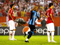 Rodrigo celebra o primeiro gol Água mole em pedra dura tanto bate até que fura. Gre-Nais costumam contrariar os ditados populares, mas não foi o caso deste domingo. Rodrigo, aos 22 minutos, em um cabeceio que pode muito bem ser chamado de tiro, flechada ou pedrada, colocou o Grêmio na frente! Foi um ato de justiça. O Tricolor merecia o gol.