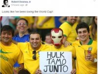 Downey Jr postou uma foto em que um torcedor usa uma máscara de seu personagem e uma cartaz com os dizer ” HULK TAMO JUNTO”, e a legenda “Looks like I’ve been loving the World Cup!” (Parece que eu tenho curtido a Copa do Mundo”.