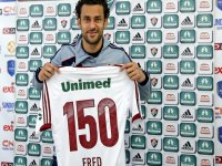 No Fluminense desde 2009, o atacante Fred é, sem dúvida, um ídolo da torcida tricolor. Prestes a completar 150 jogos pela equipe carioca, o jogador recebeu, neste sábado, um presente do diretor Rodrigo Caetano: uma camisa com o número da marca realizada.