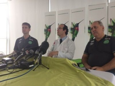 Ao lado do diretor do hospital colombiano, Ferney Rodríguez, o médico intensivista Edson Stakonski e o ortopedista Marcos André Sonagli, que representam a Chape na Colômbia, explicaram o estado de saúde dos jogadores Alan Ruschel, Neto, Jackson Follmann e do jornalista Rafael Henzel.