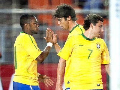 Robinho e Kaká comemoram um dos gols do Brasil na goleada sobra a Tanzânia (Foto: AFP)