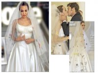 Depois de muito mistério, foram divulgadas as primeiras fotos do casamento de Angelina Jolie e Brad Pitt. Linda, a atriz usou um vestido de seda Versace assinado por Luigi Massi com direito a longo véu estampado com desenhos feitos pelos seis filhos do casal. “Luigi é como uma família para mim e eu não poderia imaginar nenhuma outra pessoa desenhando este vestido”, declarou a morena à revista People, que traz a foto do casório estampada na capa da nova edição. O ator usou um terno de seu próprio guarda-roupa e teve de pedir uma gravata emprestada de um de seus filho, pois esqueceu a sua em casa.