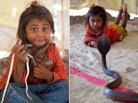 Apesar da idade, as indianas Rekha Bae (esq), de seis anos, e Meru Nath Madari, de quatro, se arriscam como encantadoras de cobras. As meninas fazem parte da comunidade de Vadi, que vive atualmente na periferia de Rajkot, no estado indiano de Gujarat, e há centenas de anos domina a técnica do encantamento de serpentes. (Foto: Niklas Halle/Barcroft Media/Getty Images) .