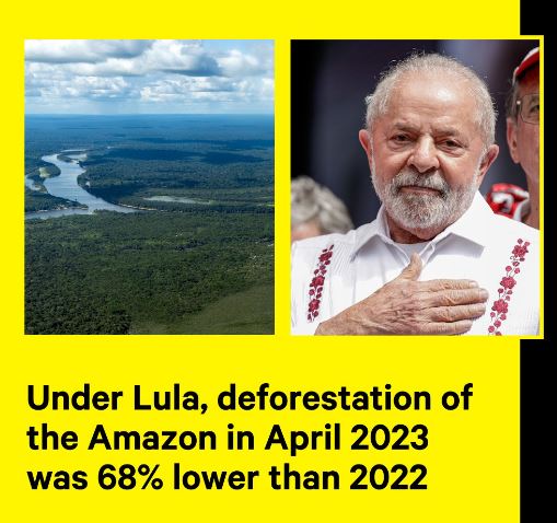 O post expõe uma foto da mata amazônica e uma do presidente Lula com a manchete: “Under Lula, deforestation of the Amazon in April 2023 was 68% lower than 2022″ – (Sob Lula, desmatamento da Amazônia em abril de 2023 foi menor que em 2022).