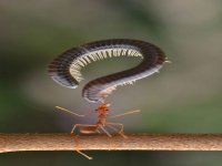 O estudante Frenki Jung, que vive na cidade de Sambas, em Bornéu, na Indonésia, flagrou uma cena inusitada no jardim de sua casa. Ele fotografou o momento em que uma formiga conseguiu a façanha de capturar uma centopéia com tamanho muitas vezes maior do que o seu próprio.