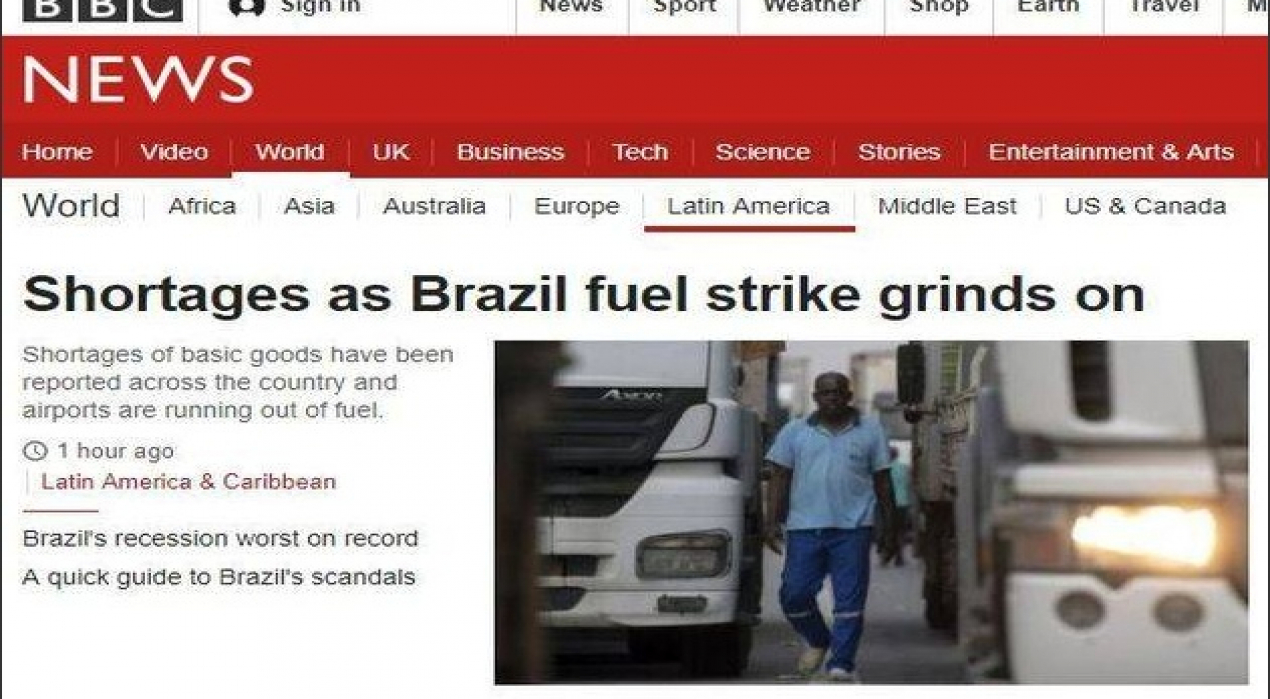 A greve dos caminhoneiros que paralisa o Brasil há seis dias é assunto na imprensa internacional. A manchete da página sobre América Latina da BBC News destaca o desabastecimento provocado por uma greve que não acaba.