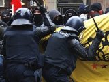 Muitos neste grupo estavam mascarados, com capuzes e óculos de sol e jogaram garrafas contra os agentes.
