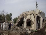 Autoridades e curiosidades em frente aos escombros de uma delegacia que foi atacada por extremistas com carro-bomba em Lakki Marwat, nesta segunda-feira (6) (Foto: G.A. Marwat / AP)“Um terrorista dirigindo um carro-bomba atingiu a parte de trás do posto policial”, disse à France Presse o chefe de polícia Gul Wali Khan. Segundo outro oficial, Iftijar Ahmad, 9 dos mortos eram policiais.