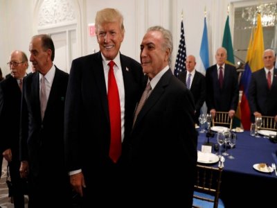 O presidente Michel Temer chegou às 18h35 para o jantar com seus colegas Donald Trump (Estados Unidos), Juan Manuel Santos (Colômbia) e Juan Carlos Varela (Panamá), em Nova York. O mandatário brasileiro chegou atrasado ao evento, devido ao intenso trânsito na cidade americana. Não há agenda fechada para a reunião, mas certamente será debatido a Venezuela. Fontes diplomáticas acreditam que Trump quer se aproximar da América Latina, ouvindo seus líderes.