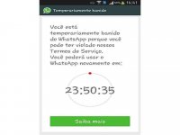 A mensagem de bloqueio aparece no alto da tela “temporariamente banido”. Abaixo, uma frase confirma a obstrução: “Você está temporariamente banido do WhatsApp porque você pode ter violado nossos Termos de Serviço”.