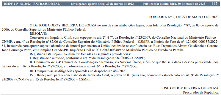 O procurador federal Jose Godoy Bezerra de Souza converteu em Inquérito Civil a Notícia de Fato de nº 1.24.001.000137/2022-81, instaurada para apurar o suposto abandono de um imóvel pertencente à União localizado na confluência das Ruas Deputados Álvaro Gaudêncio e Coronel João Lourenço Porto, em Campina Grande.
