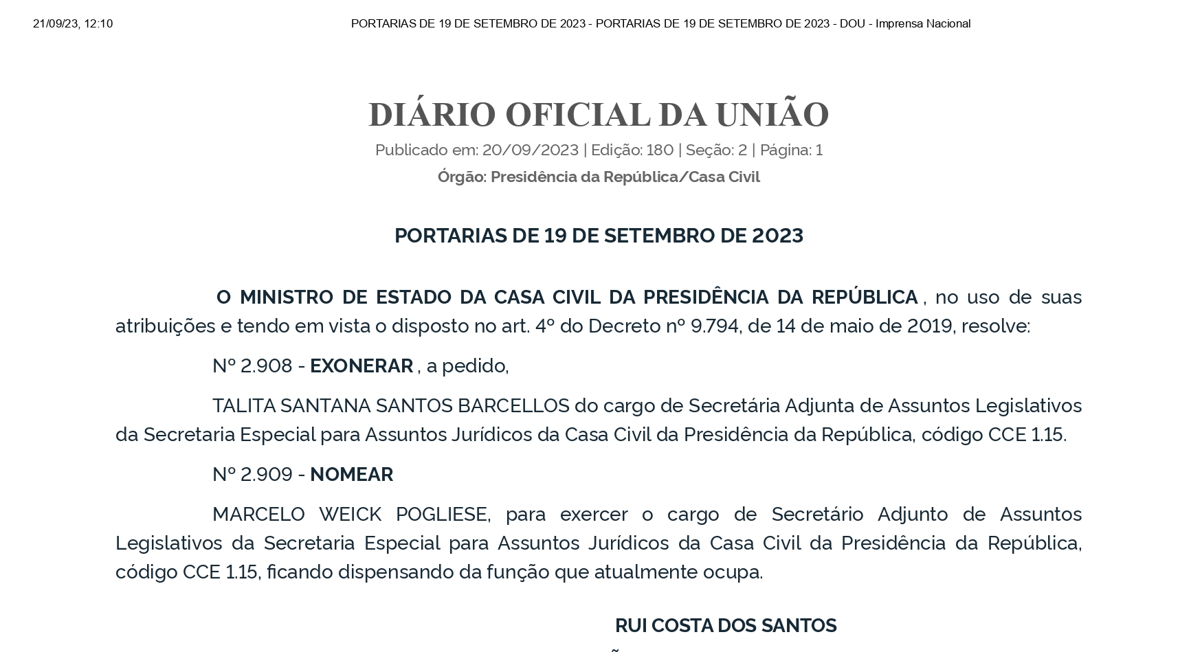 Segundo a Portaria nº 2.909, datada de 19 de setembro de 2023, Weick assume oficialmente “o cargo de Secretário Adjunto de Assuntos Legislativos da Secretaria Especial para Assuntos Jurídicos da Casa Civil da Presidência da República, código CCE 1.15, ficando dispensado da função que atualmente ocupa”.
