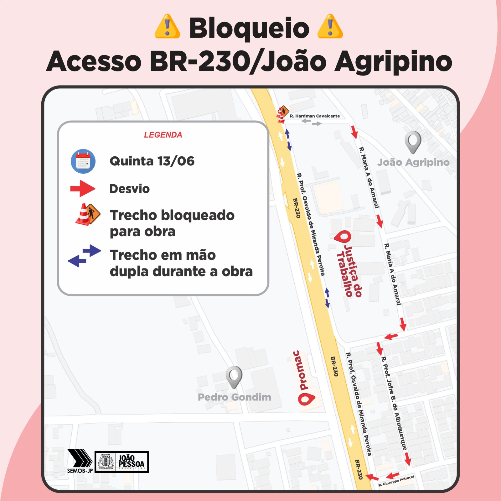 Nesta quinta-feira (13), haverá um bloqueio na alça de acesso à BR-230, localizada na Rua Professor Osvaldo de Miranda Pereira, no bairro do João Agripino. A interdição começará às 10h e é necessária para a construção de uma nova alça que permitirá aos veículos acessar a BR-230 com maior segurança e eficiência, melhorando o tráfego para os motoristas da região.