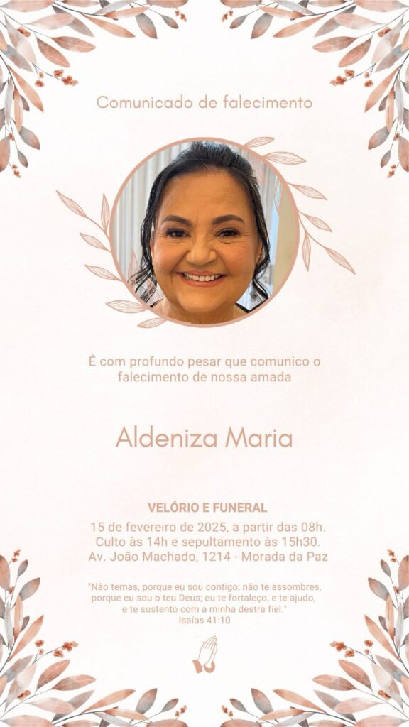 Na manhã deste sábado (15), amigos, familiares e funcionários da Cagepa emitiram nota de pesar lamentando a morte da servidora pública Aldeniza Maria Sousa Gomes. De acordo com a nota, Aldeniza Gomes era lotada na Gerência Regional do Litoral, em Marés, em João Pessoa. Seu sepultamento será esta tarde, no Cemitério Santa Catarina.