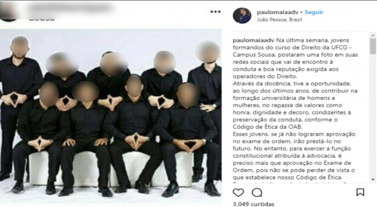 Polêmica. Estudantes de uma turma de Direito da Universidade Federal de Campina Grande (UFCG), do campus de Sousa, protagonizaram um ato que não foi bem visto nem pela instituição de ensino e nem pela Ordem dos Advogados da Brasil na Paraíba (OAB-PB). Os alunos posaram para foto da formatura com gestos que supostamente represtavam uma vagina.