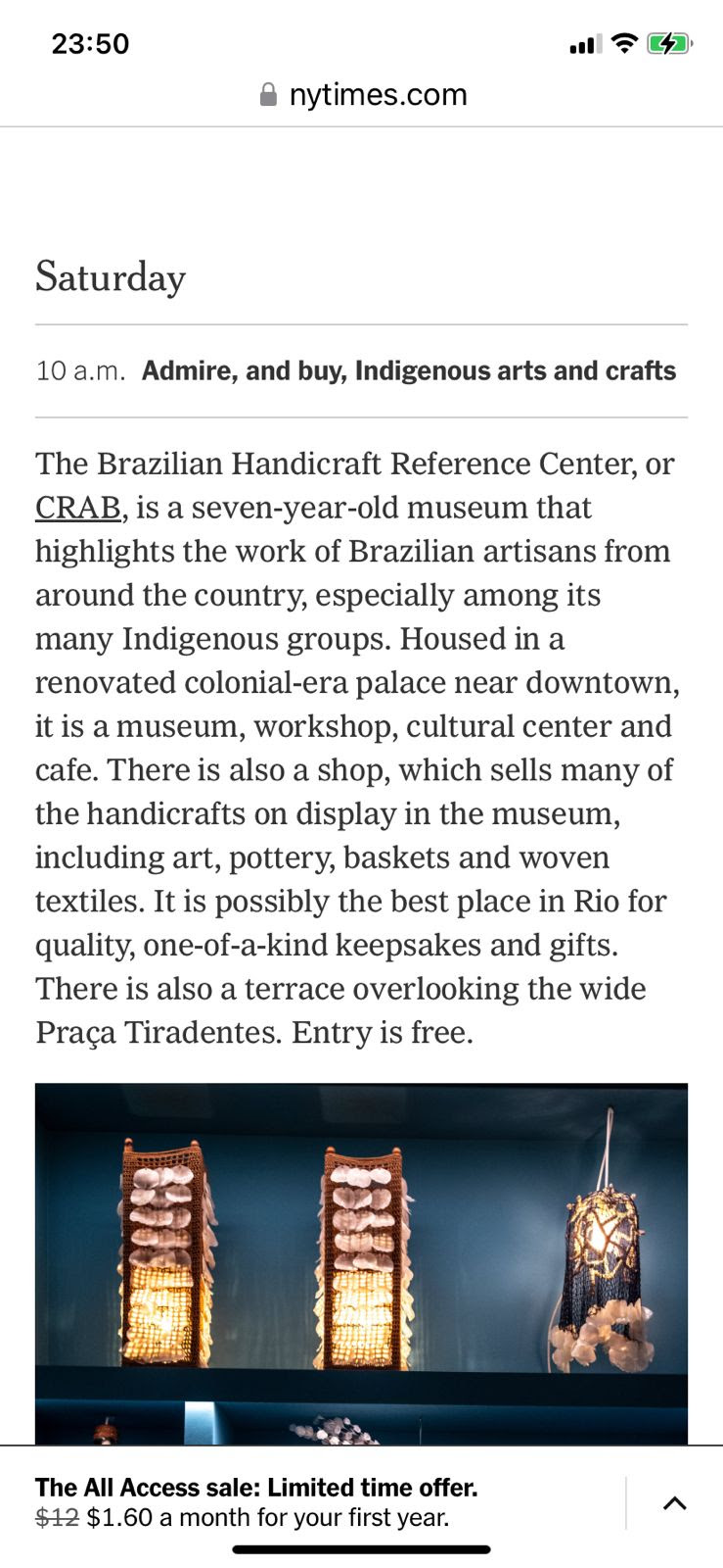 Na matéria, publicada no caderno de Turismo na edição de sexta-feira (3), ao citar os sete anos de existência do Crab, o “New York Times” destaca a exposição do trabalho dos artesãos paraibanos, pontuando os grupos indígenas, que inclusive foram homenageados na realização do 35° Salão do Artesanato Paraibano, realizado de 13 de janeiro a 5 de fevereiro em uma megaestrutura na Orla marítima de João Pessoa, com recorde de inscritos — 539 artesãos ao todo — e de comercialização, com mais de R$ 2,5 milhões.