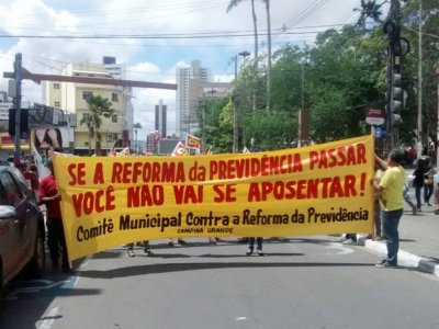 Em protesto contra a Reforma da Previdência e Trabalhista, representantes de centrais sindicais e de sindicatos caminharam pelo Centro de Campina Grande na manhã desta quarta-feira.. Os manifestantes caminharam da sede do Instituto Nacional de Seguridade Social (INSS) até o prédio da Empresa de Correios e Telégrafos (ECT).