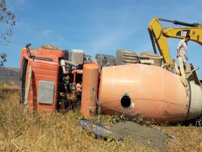 A betoneira que tombou hoje estava cheia de brita e foi desvirada por uma retroescavadeira da mesma firma, com a ajuda de funcionários que estavam trabalhando no local. A rodovia está em construção e muito sinuosa, por isso, requer a atenção redobrada dos motoristas que trafegam na estrada. As informações e fotos são do portal Radar Sertanejo