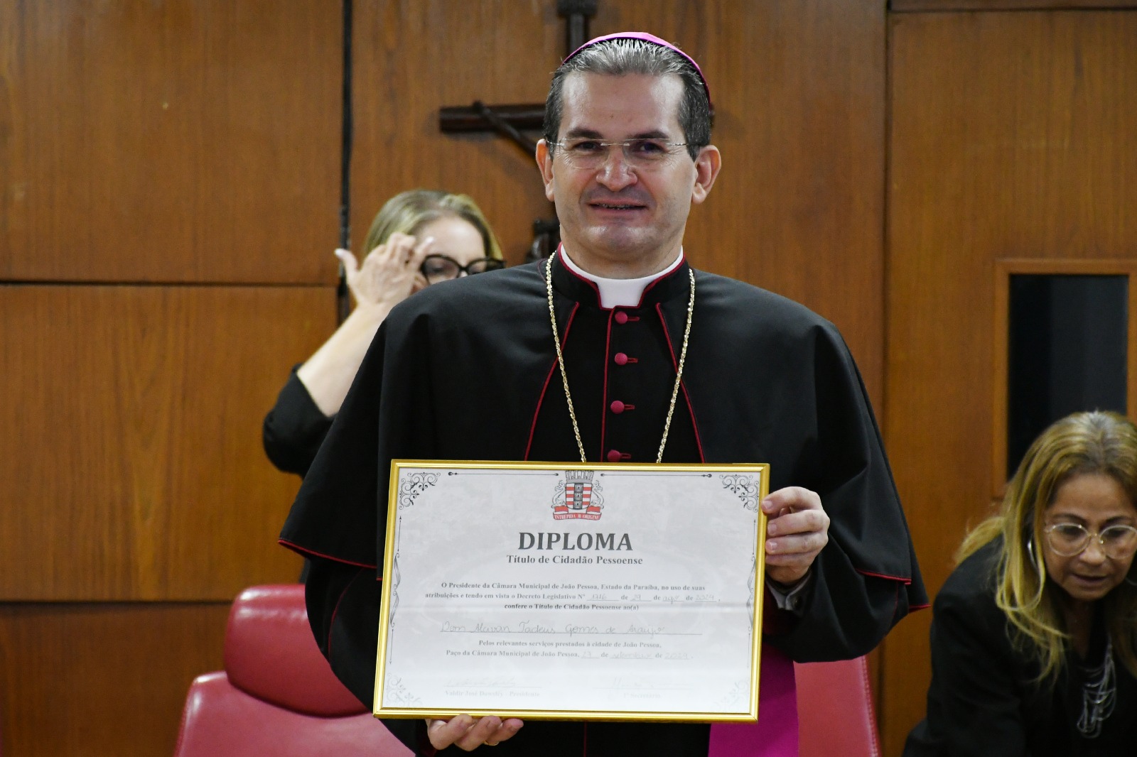 A Câmara Municipal de João Pessoa (CMJP) realizou, na tarde desta sexta-feira (27), sessão solene para entrega do Título de Cidadão Pessoense a Dom Alcivan Tadeus Gomes de Araújo, Bispo Auxiliar da Arquidiocese da Paraíba. A solenidade foi proposta pelo vereador Carlão (PL).