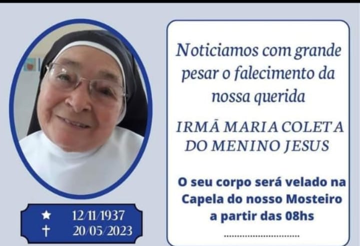 O prefeito Bruno Cunha Lima emitiu nota de pesar, neste domingo, 21, pelo falecimento da Irmã Coleta, 86, do Mosteiro Santa Clara (Clarissas), em Campina Grande. A passagem dela, na noite deste sábado, deu-se por causas naturais