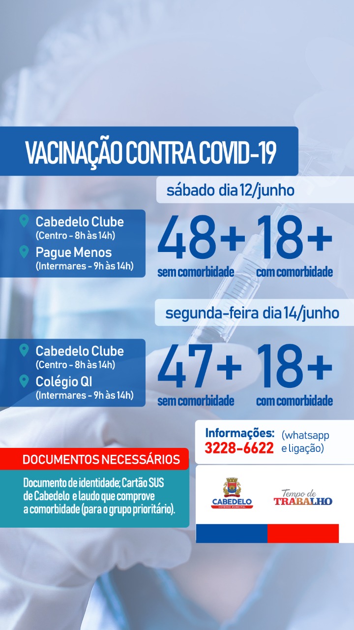 Cabedelo vem avançando significativamente na campanha de vacinação contra a Covid. A partir deste sábado (12), começa a vacinação para pessoas acima de 48 anos sem comorbidades.