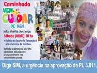 A campanha Vem Cuidar de Mim, que tem como objetivo a aprovação do Projeto de Lei 3011, que assegura o afastamento do empregado em caso de doença grave do filho ou dependente, realizará no próximo sábado (08), a partir das 17h30, saindo do Busto de Tamandaré até a Feirinha de Tambaú, uma grande caminhada em prol dos diretos da criança com câncer e outras doenças graves.
