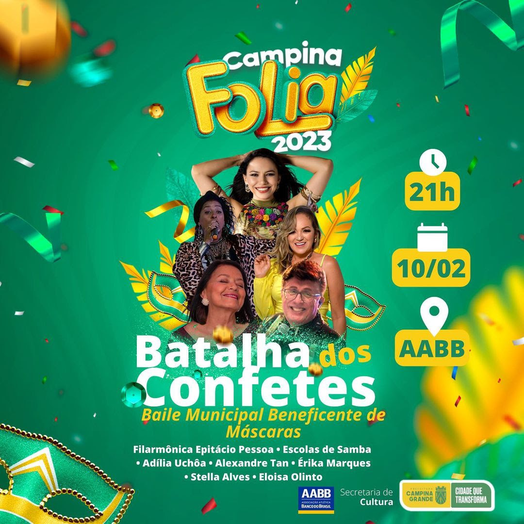 O Baile Municipal Beneficente de Máscaras “Batalha dos Confetes” ocorrerá nesta sexta-feira (10). O evento, realizado pela Prefeitura de Campina Grande, através da Secretaria de Cultura (Secult), e Associação Atlética Banco do Brasil de Campina Grande (AABB-CG), inicia a partir das 21h e integra o Circuito Cultural do Campina Folia 2023.