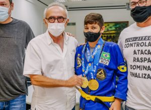 O prefeito Cícero Lucena recebeu, na tarde desta segunda-feira (09) em seu gabinete no Centro Administrativo Municipal (CAM), o atleta Arthur Piloto Oliveira de Sousa, pessoense que ganhou o ouro no Pan Kids IBJJF Jiu Jitsu Championship 2021, nos Estados Unidos. O encontro foi oportunidade para parabenizar o atleta de 11 anos, que viajou com apoio da Prefeitura de João Pessoa.