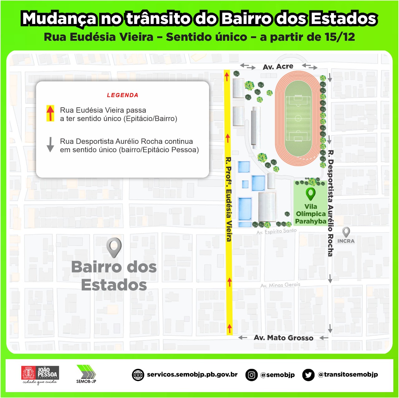 A Prefeitura de João Pessoa, seguindo com o compromisso de dialogar com a população, vai atender a mais uma solicitação referente à mudança de trânsito, com o objetivo de reduzir transtornos ao fluxo viário na cidade. A nova intervenção será implantada pela Superintendência Executiva de Mobilidade Urbana (Semob-JP) a partir desta quarta-feira (15), quando a Rua Professora Eudésia Vieira, localizada no entorno da Vila Olímpica Parahyba, no bairro dos Estados, passará a ter sentido único.