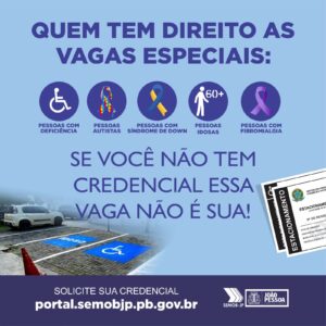 Além do público autista, a Semob-JP também emite este tipo de documento para pessoas com deficiência, com síndrome de Down, fibromialgia e com mais de 60 anos. A solicitação pode ser protocolada pelo site: portal.semobjp.pb.gov.br ou pela App Prefeitura na Palma da Mão. Entre os documentos necessários estão: documento de identificação com foto, foto 3×4, comprovante de residência emitido há no máximo três meses e laudo médico (em caso de diagnóstico de deficiência e/ou doença).