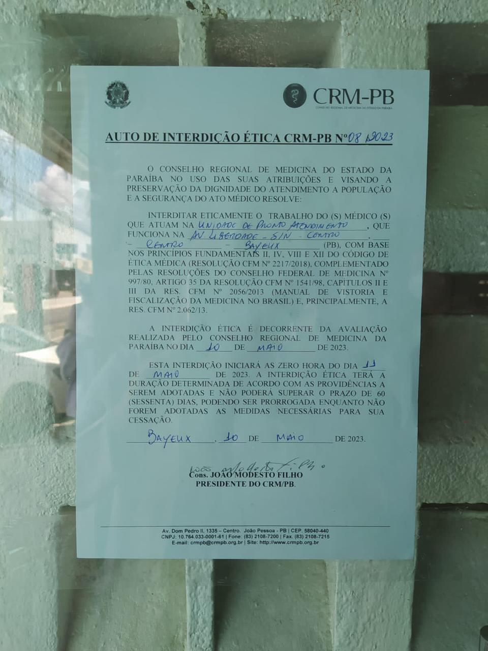 Diante desse cenário preocupante, o CRM-PB decidiu pela interdição ética da UPA de Bayeux, a partir da meia-noite desta quinta-feira (11). Essa medida impede que a unidade receba novos pacientes, mas permite que os cuidados sejam mantidos para os pacientes já internados, evitando a desassistência imediata.