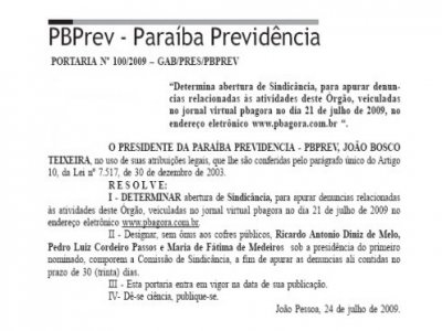 No Diário Oficial desta quinta-feira (30), o presidente do Instituto da Previdência da Paraíba (PBPrev), João Bosco Teixeira, publica portaria instaurando uma sindicância para apurar denúncias de irregularidades publicadas, no último dia 21 de julho deste ano. A matéria revelou, com exclusividade, ofício encaminhado por um grupo de deputados da Oposição ao Tribunal de Contas do Estado, relatando uma série de indícios de atos administrativos irregulares.