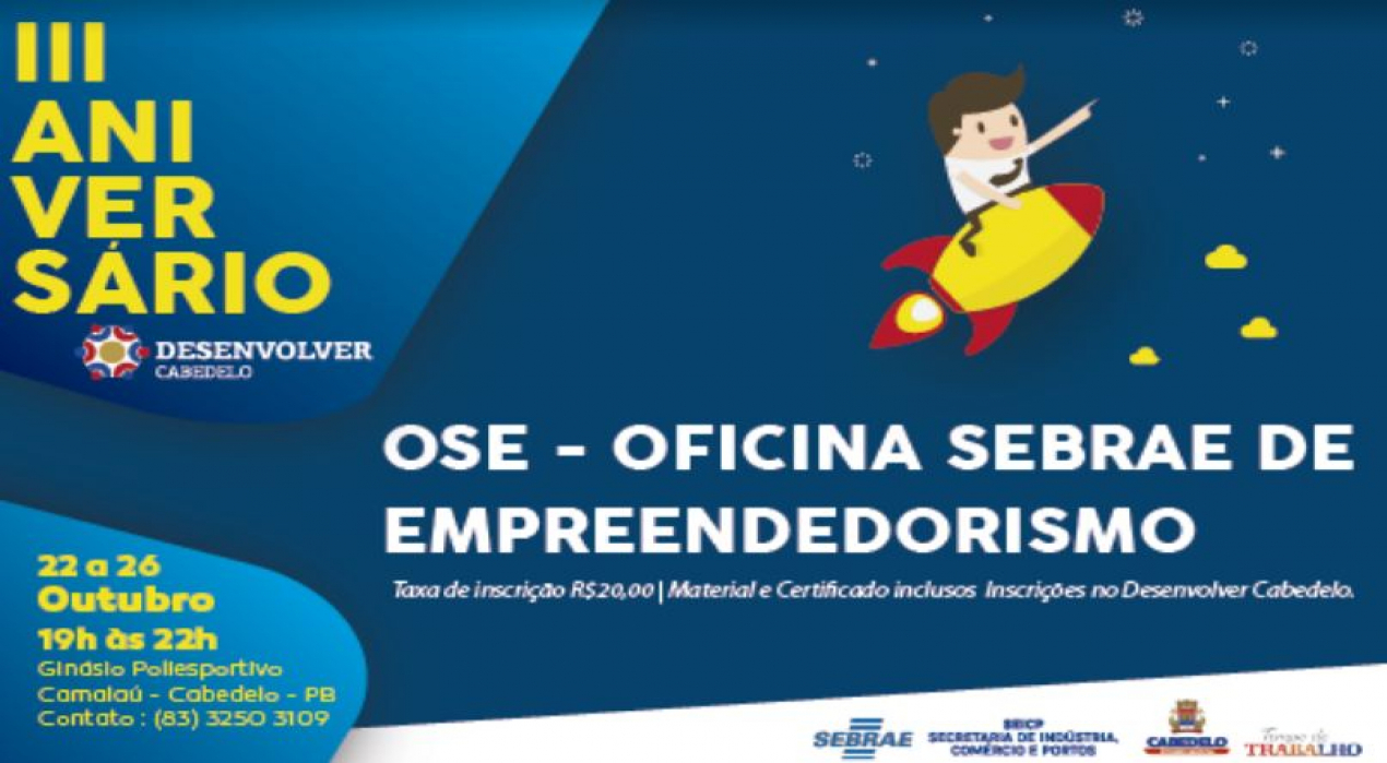 O programa Desenvolver Cabedelo comemora 3 anos de atuação na cidade, promovendo o crescimento e a autonomia financeira de mais de 300 microempreendedores (MEIs). Para marcar a data, a Prefeitura Municipal de Cabedelo (PMC) está com inscrições abertas para a Oficina Sebrae de Empreendedorismo, que acontecerá de 22 a 26 de outubro, no Ginásio de Camalaú.