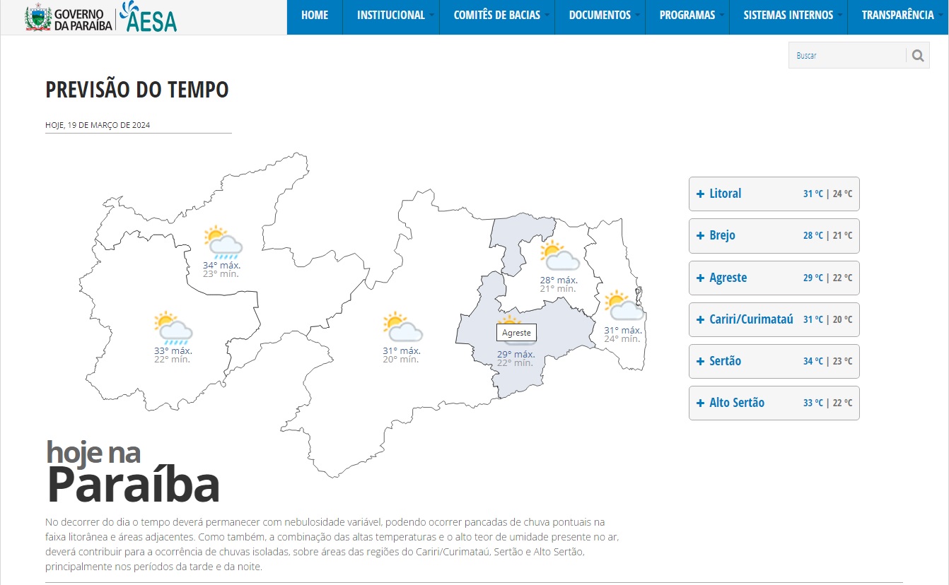 De acordo com a Agência Executiva de Gestão das Águas da Paraíba (Aesa), a previsão do clima para esse dia 19 de março no estado é a seguinte: