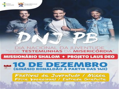 O DNJ 2016 vai ser realizado no Ginásio O Ronaldão, na BR 230, com o tema “Sede testemunhas da Misericórdia”. O evento terá as presenças do Pe. Marcelo Monte (Padre Referencial do Setor Juventude da Arquidiocese da Paraíba) e do Administrador Apostólico, Dom Genival Saraiva. Na programação: palestra, Santa Missa, apresentações regionais através do Festival da Juventude, além da Feira Vocacional que dará aos jovens a possibilidade de conhecer as inúmeras vocações suscitadas na Arquidiocese.