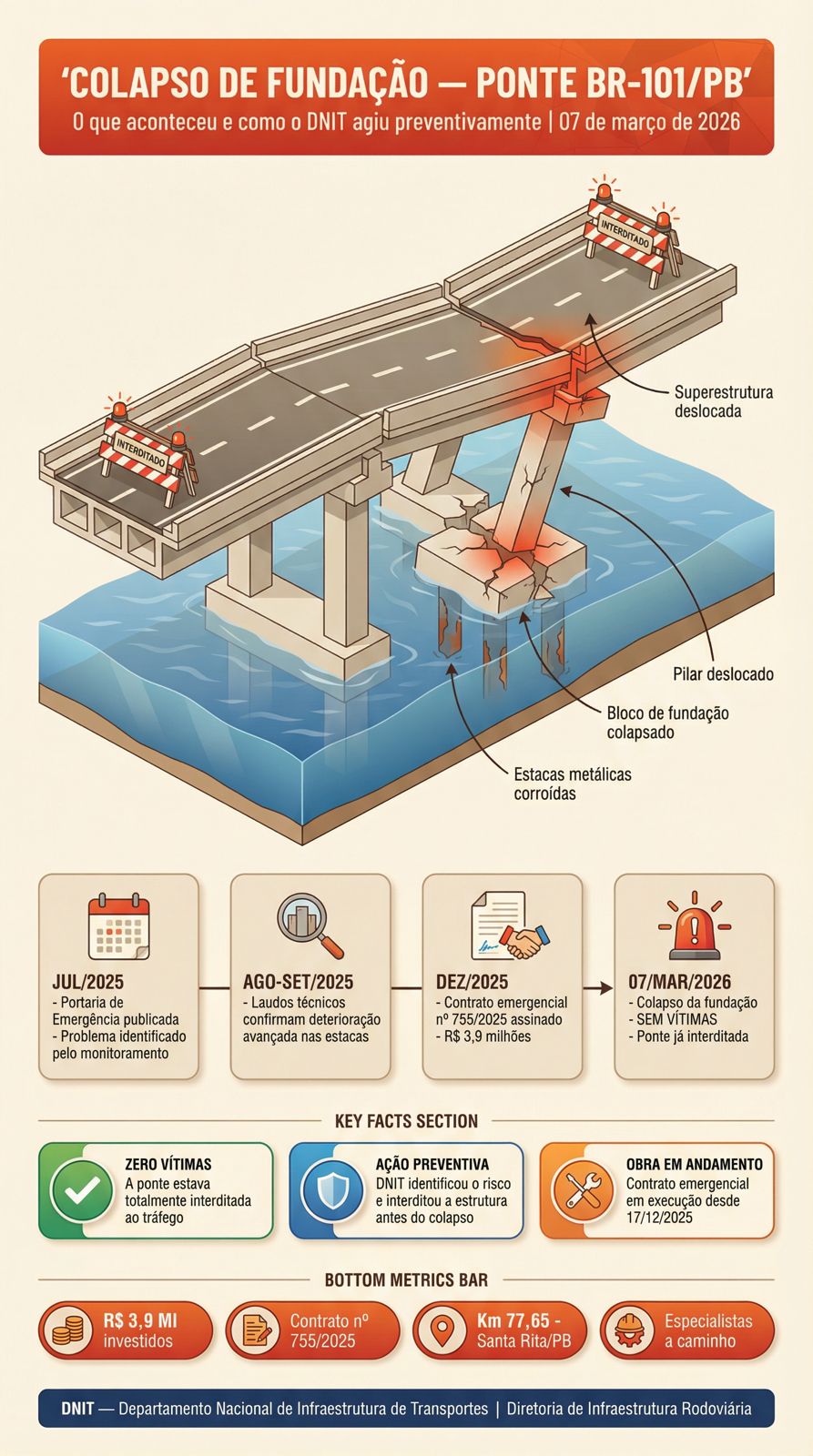 A Superintendência do DNIT no Estado da Paraíba vem comunicar que 2(dois) vãos do trecho da Ponte Sobre o Rio Paraíba no km 77,65 da BR-101/PB, que se encontrava interditada desde SET/2025, sofreu colapso em um dos seus apoios (AP03), fazendo com que os dois tramos viessem a ceder.