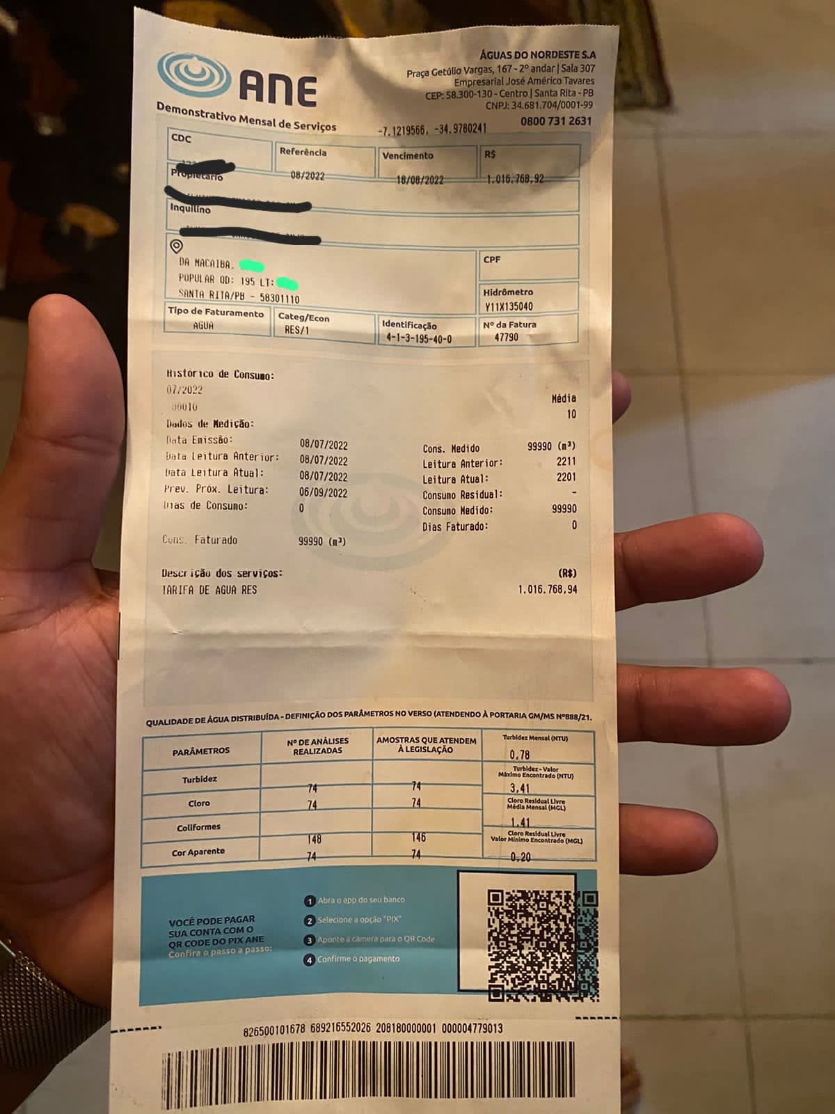 Em nota divulgada nesta segunda-feira (5), a ANE, responsável pelo fornecimento de água potável ao município de Santa Rita, na Região Metropolitana de João Pessoa, afirmou que a fotografia de uma fatura no valor de R$ 1 milhão.