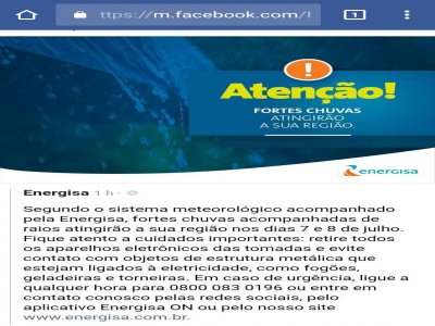 “Fique atento a cuidados importantes: retire todos os aparelhos eletrônicos das tomadas e evite contato com objetos de estrutura metálica que estejam ligados à eletricidade, como fogões, geladeiras e torneiras. Em caso de urgência, ligue a qualquer hora para 0800 083 0196 ou entre em contato conosco pelas redes sociais, pelo aplicativo Energisa ON ou pelo nosso site www.energisa.com.br”, diz um trecho do comunicado.