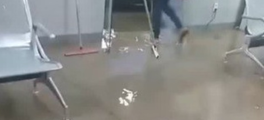 Parte do prédio ficou inundada e funcionários foram registrados usando rodos e panos para conter a água. As imagens circulam nas redes sociais.
