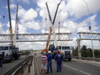 Numa operação que reuniu uma equipe de engenheiros e técnicos especializados, além de quatro guindastes, foi colocado neste domingo o vão central da passarela metálica construída pelo Governo do Estado na comunidade Boa Esperança, no km 27 da BR-230, nas proximidades do Macro, em João Pessoa. O trânsito foi interrompido às 6h e liberado às 13h30, com itinerário orientado por patrulheiros da Polícia Rodoviária Federal. Todo o trabalho foi supervisionado pelo fiscal da obra, o engenheiro do Departamento de Estradas e Rodagens (DER), Robério Moreira Leite, tendo ainda a presença de diretores do órgão Carlos Pereira de Carvalho e Silva, Hélio Cunha Lima e Filipe Braga.