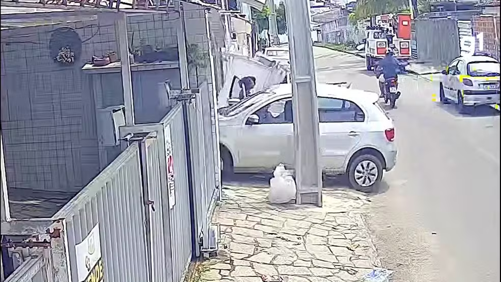 Uma idosa de 83 anos ficou ferida após ser atingida pelo portão de uma residência derrubado por um carro, no início desta semana, no bairro de Mangabeira, em João Pessoa. O acidente foi registrado por câmeras de segurança e mostra o momento em que o veículo dá ré e, com a porta lateral aberta, derruba o portão, que cai sobre a mulher.